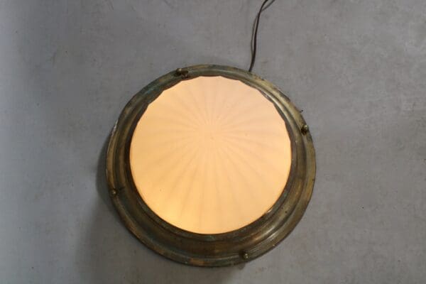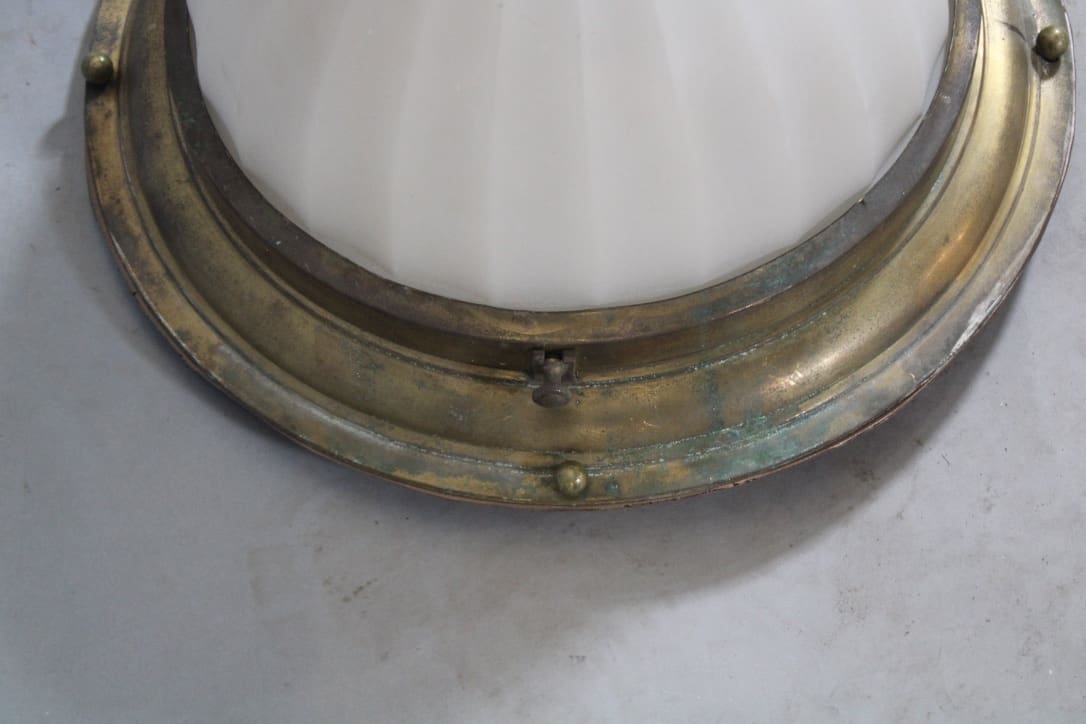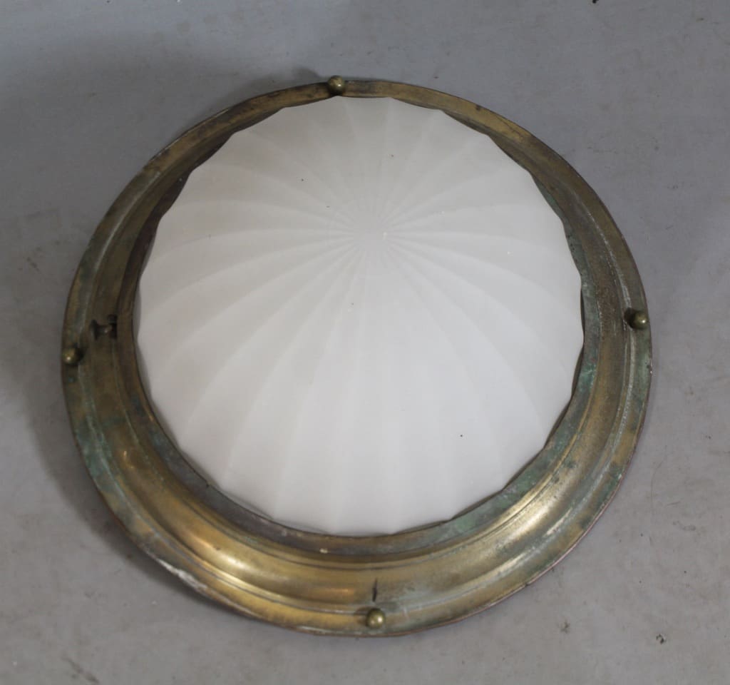 Sold and priced individually. Hard to find ceiling mount with original ridged glass. Brass mount. 7.5″ H x 15.5 W