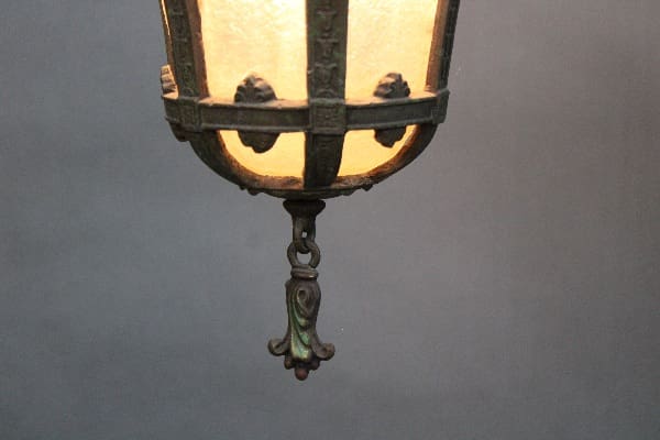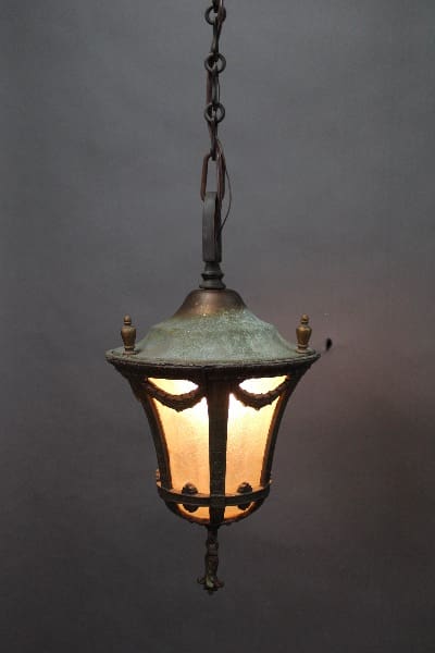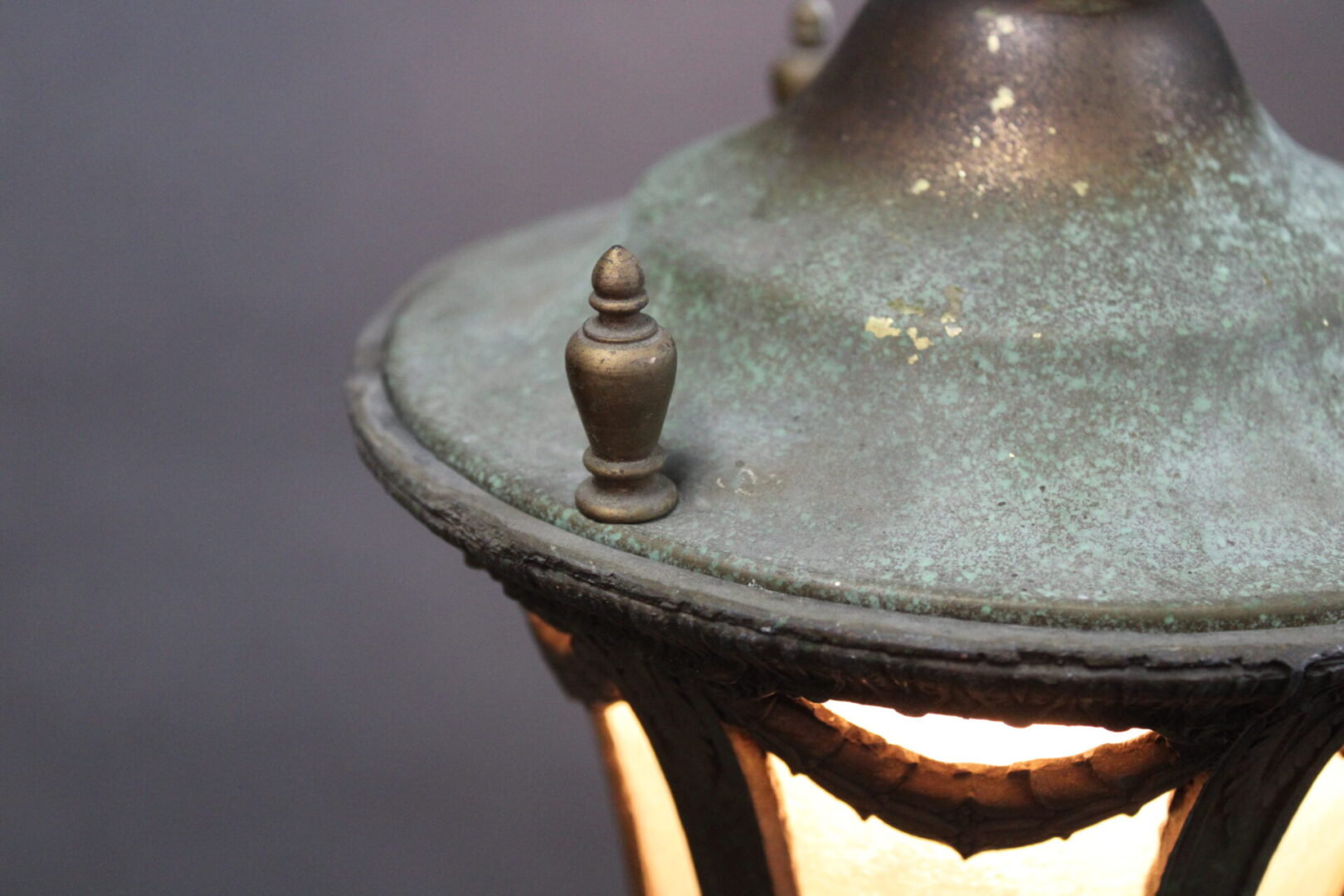 An 14606. Turn Of The Century Pendant With Original Glass with a lit bulb, featuring a verdigris finish and ornate metal detailing, suspended against a gray background.