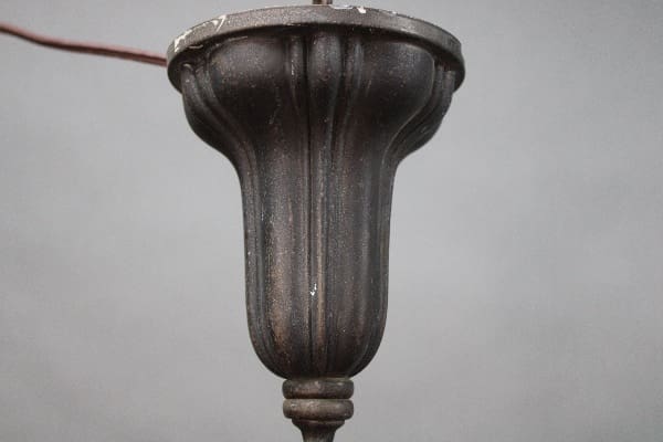 Close-up of a 14606. Turn Of The Century Pendant With Original Glass light fixture with visible wear and a gray background.