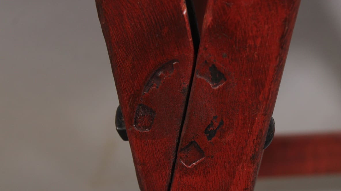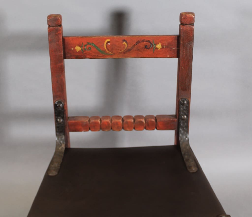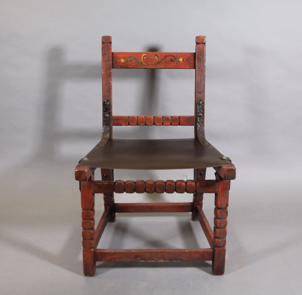 Signed with horseshoe mark Monterey red finish chair. 34.5″ H x 22.5″ W x 23″ D