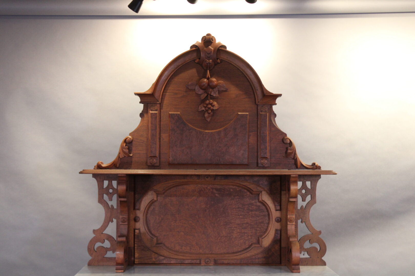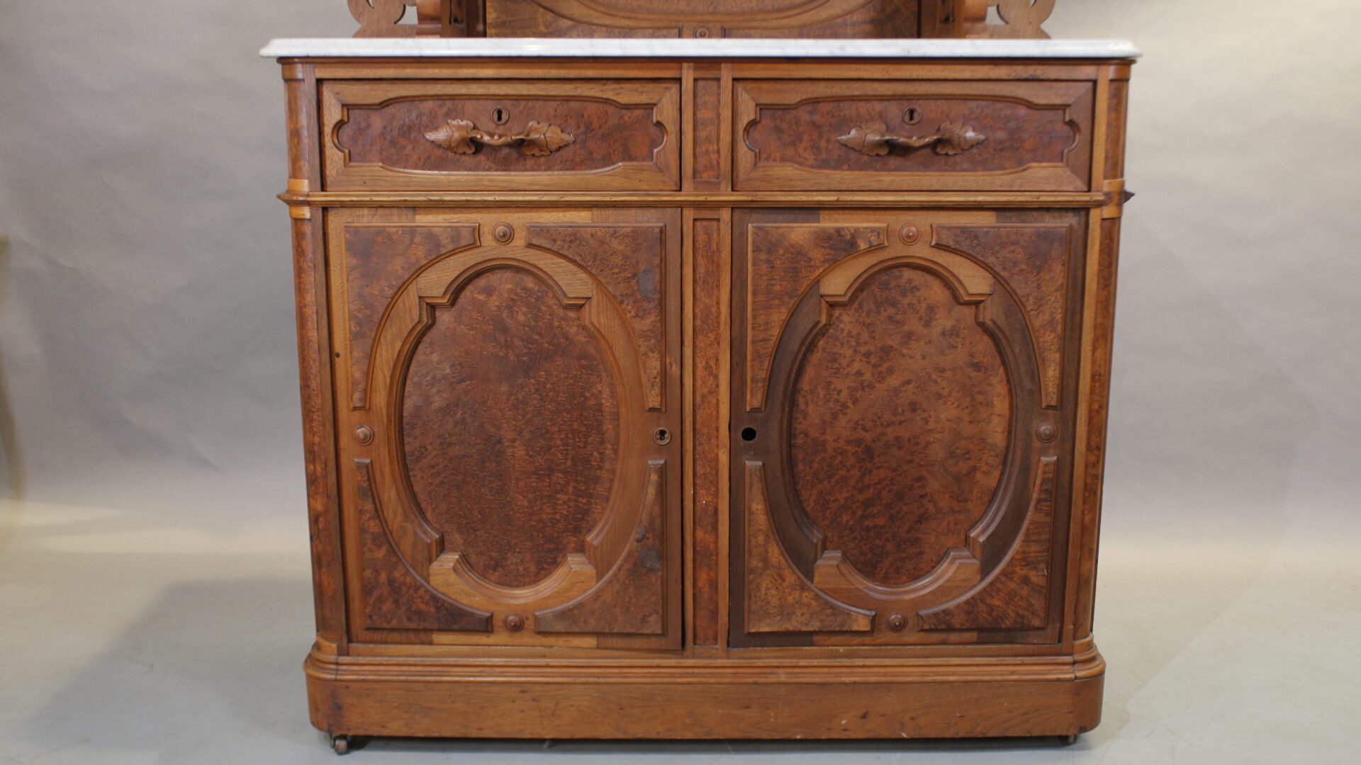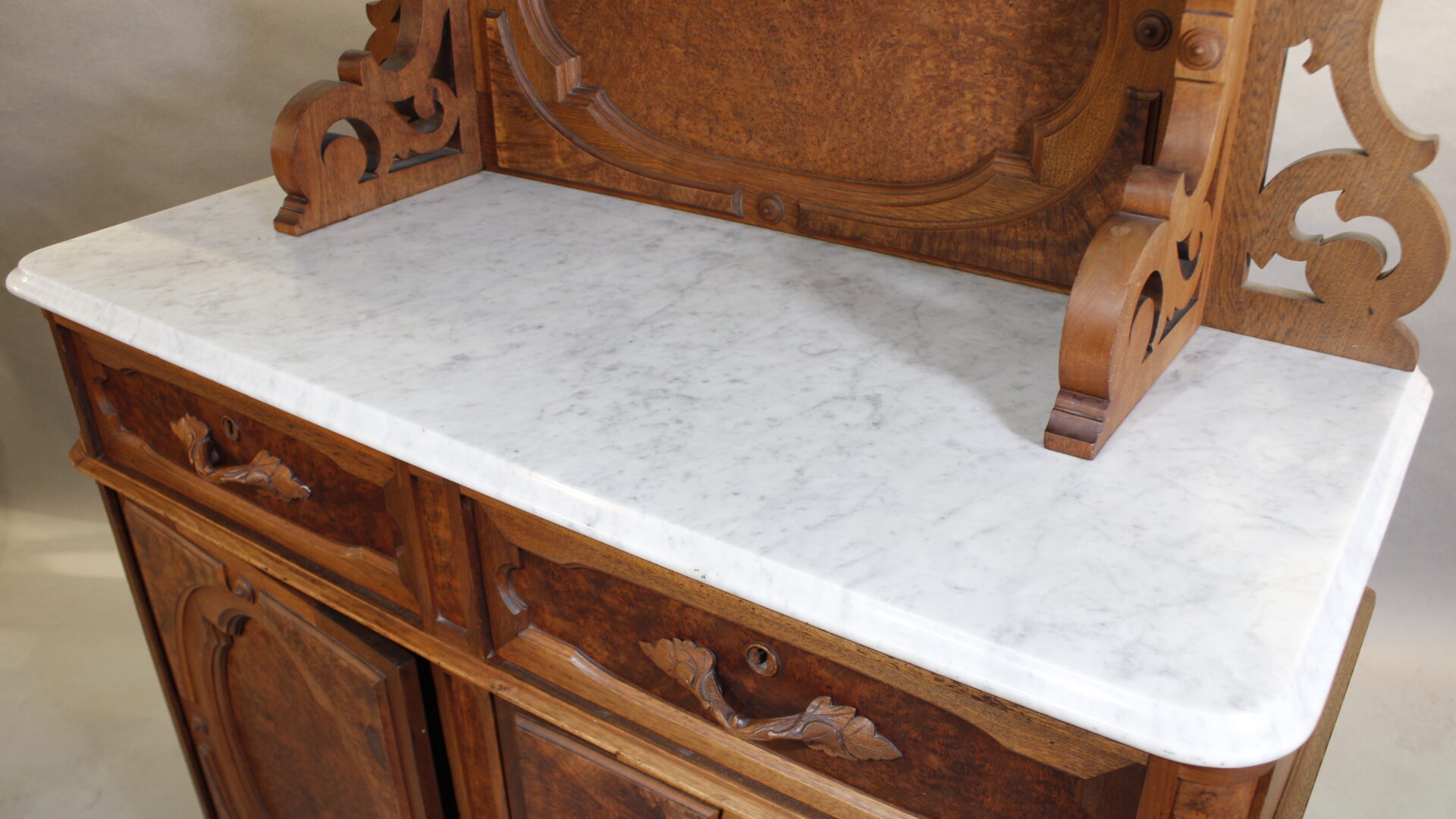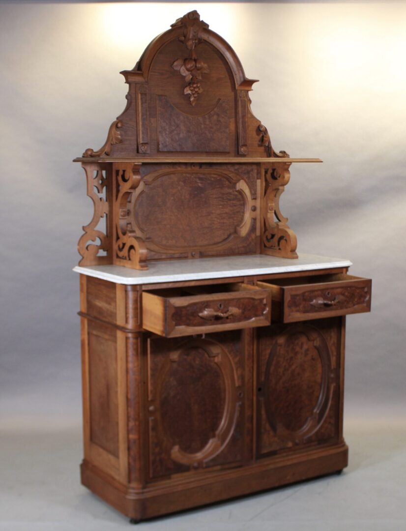 Beautiful Victorian hutch with burl wood and carved details. 87″ H x 48.5″ W x 20″ D