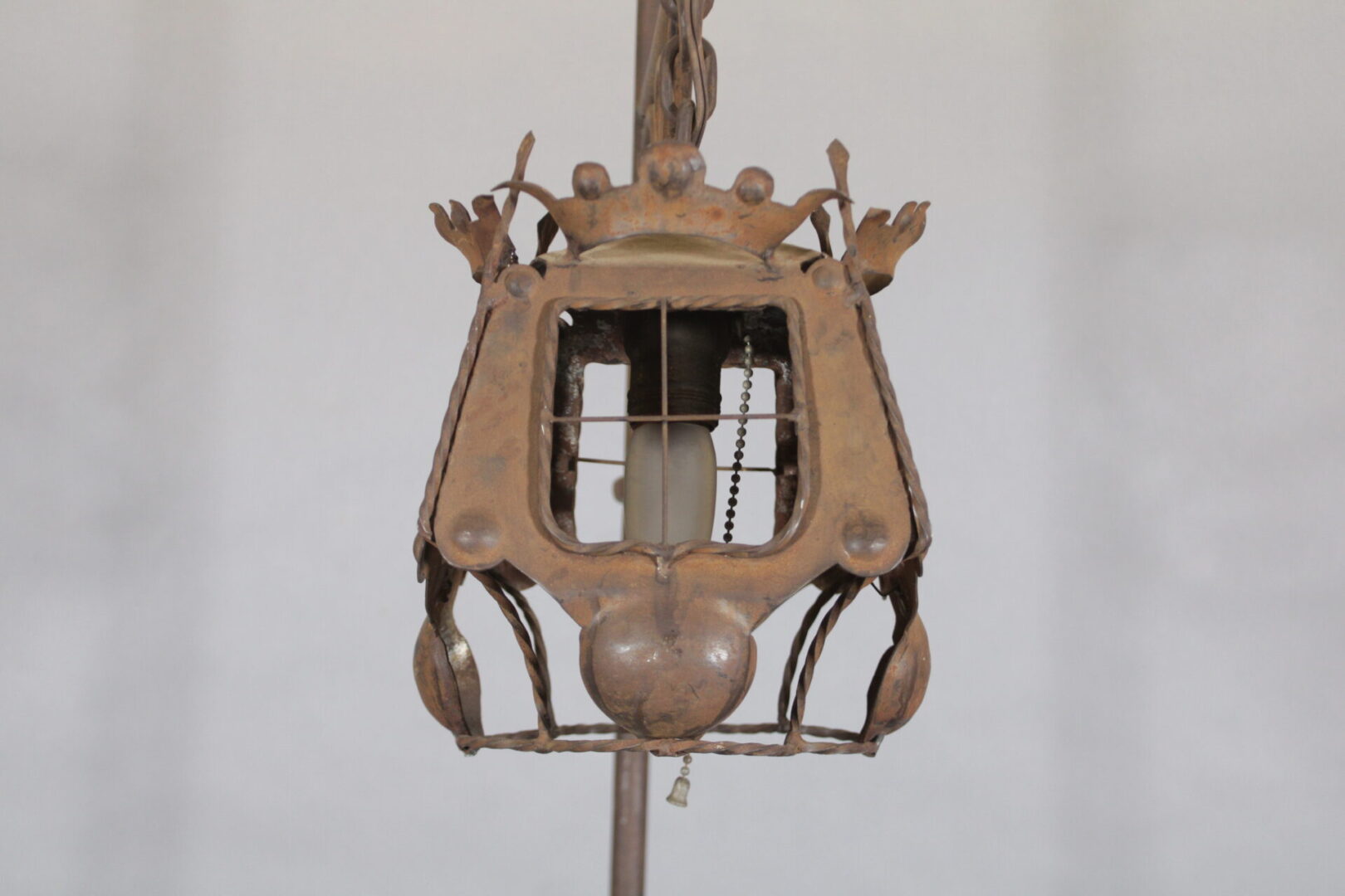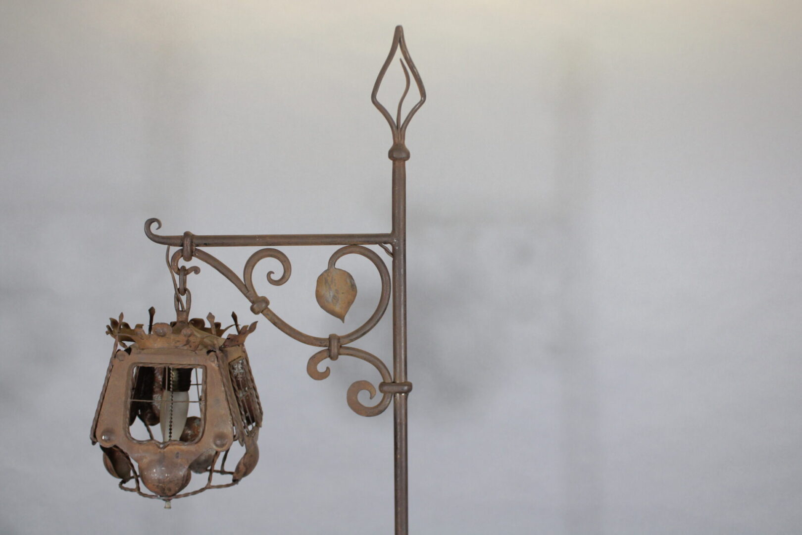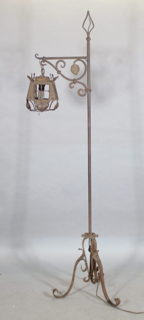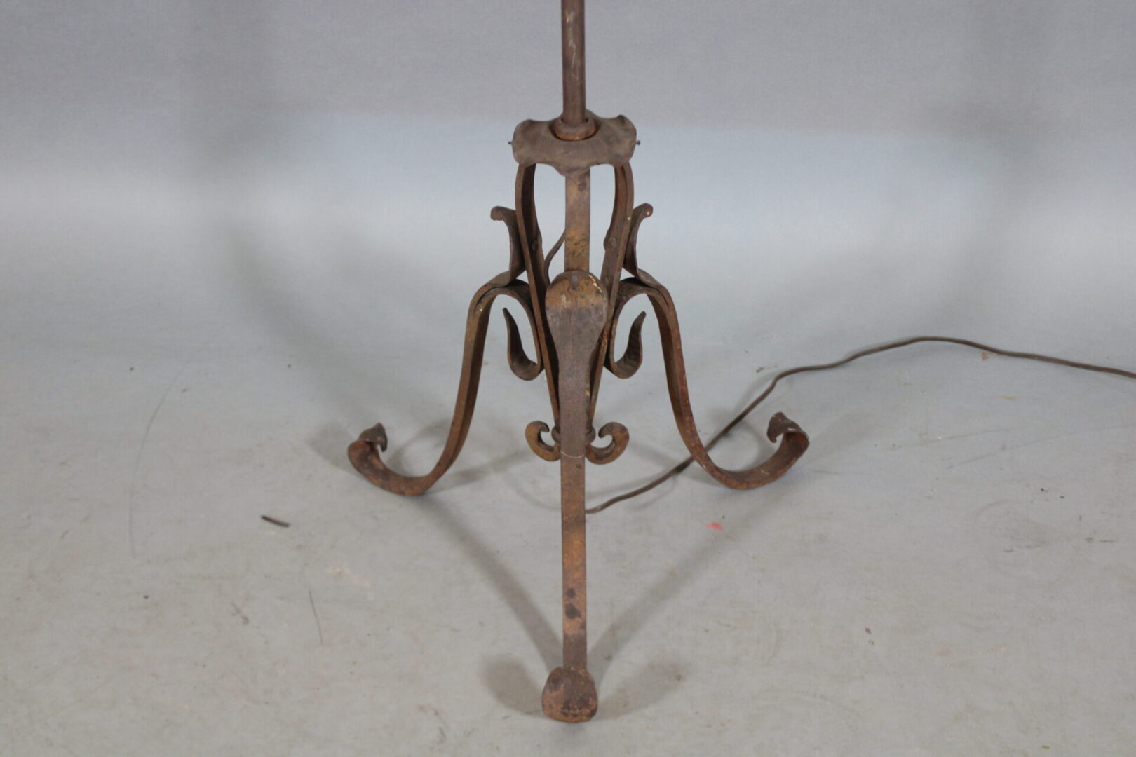 Circa 1920’s iron floor lamp on tripod base. 66.25″ H x 16″ W x 21″ D