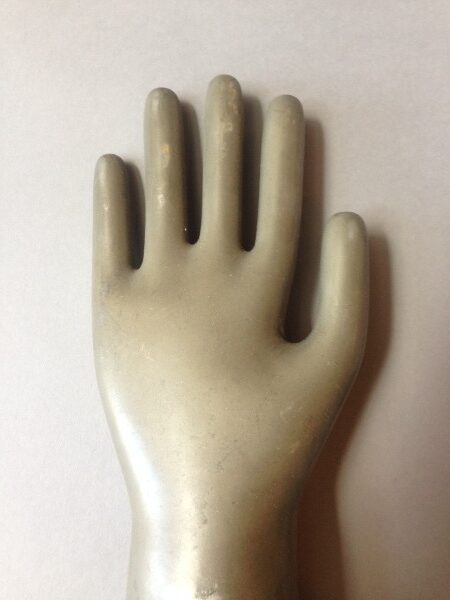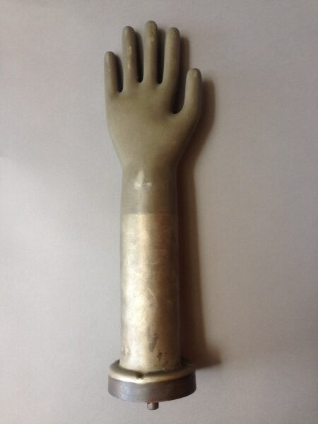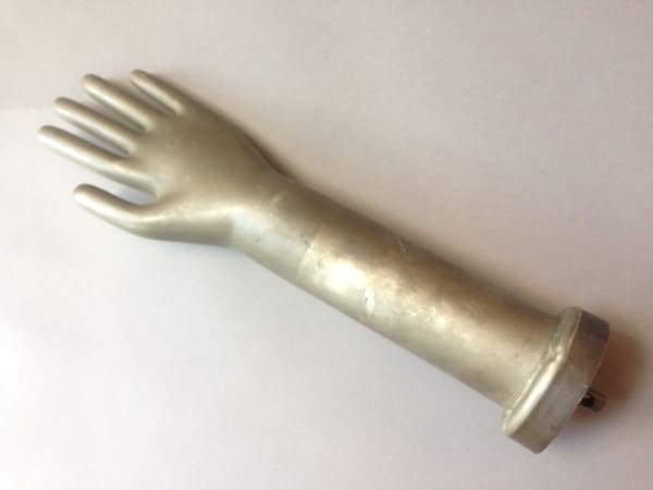 Machine age metal glove making form. 17.25″ H x 4.5″ W x 3.63″ D