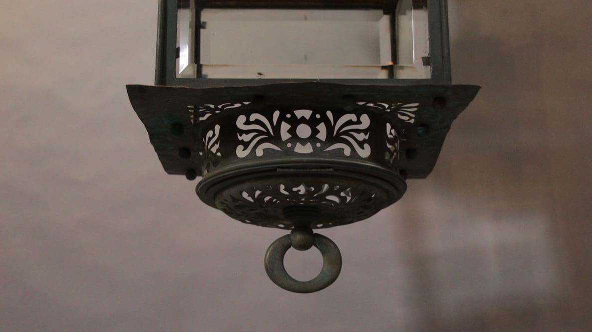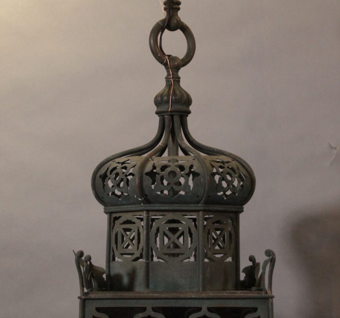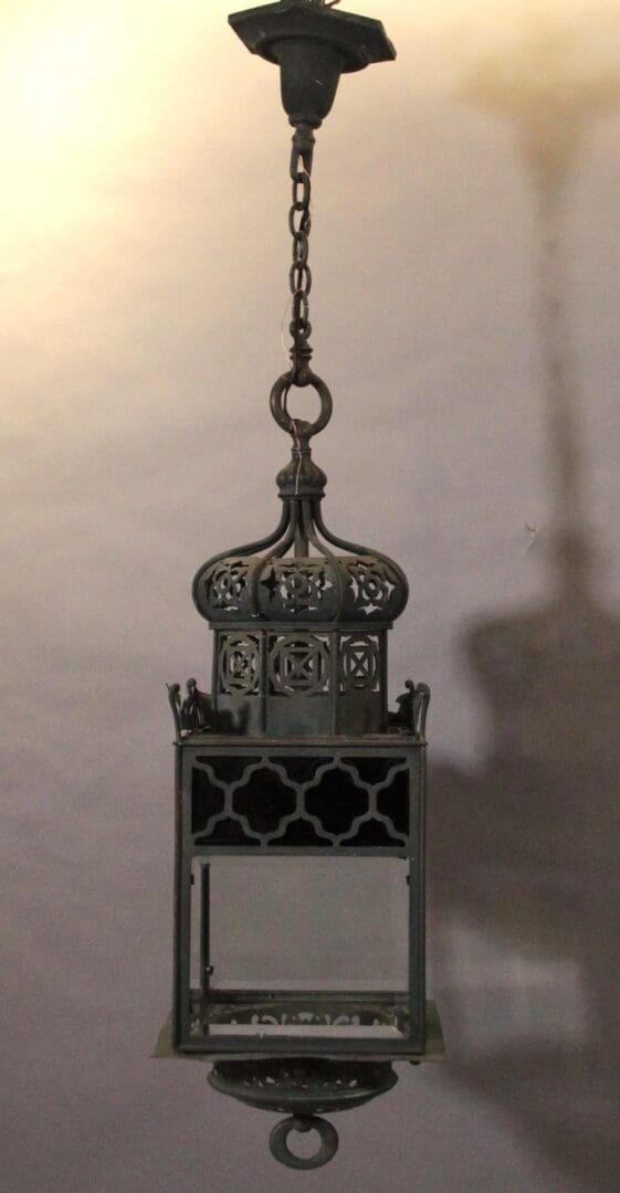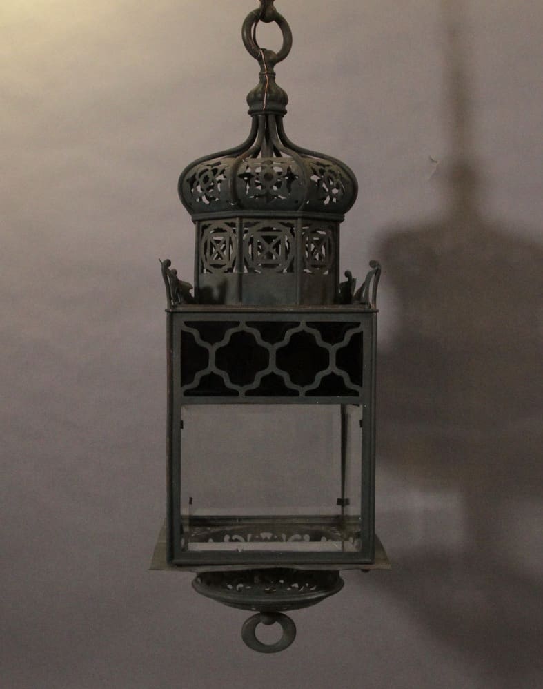 Circa 1920’s. Brass pierced Moorish lantern with beautiful craftsmanship. 49.5″ H x 11″ W x 11″D