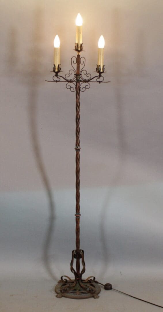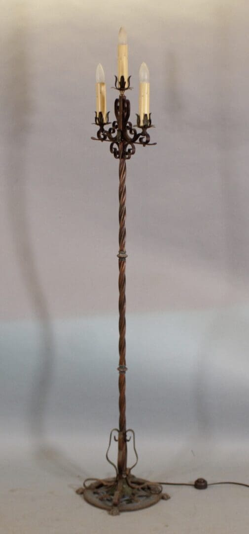 Graceful standing three light torchiere . Circa 1920’s. 65.5″ H x 15.5″ W x 12″ D