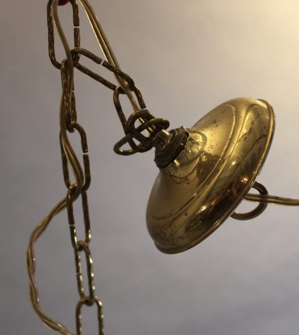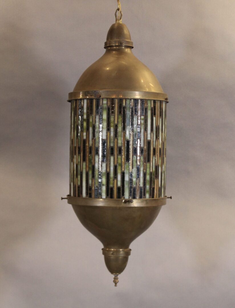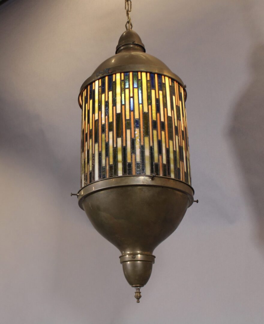 Prairie style pendant with stained glass shade. The body of the fixture is 33″ H and the total height with chain is 55″ H x 11.5″ W x 11.5″