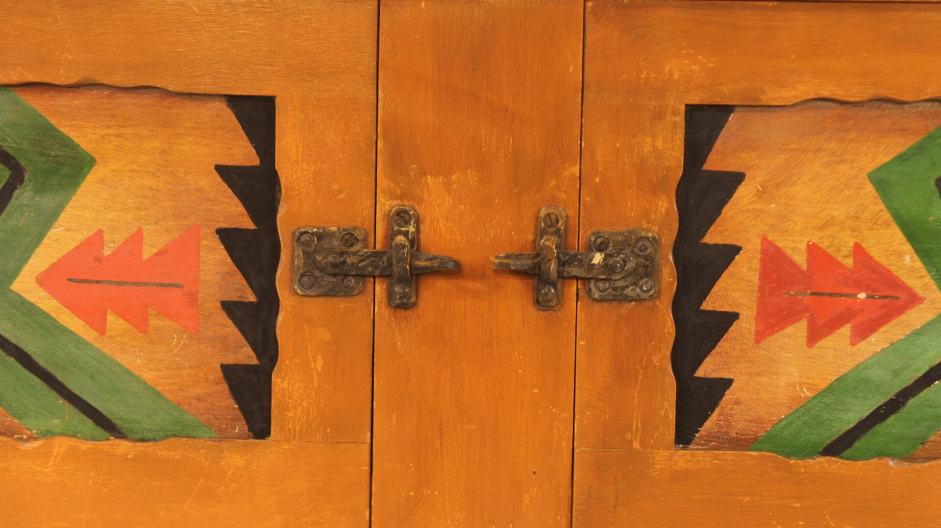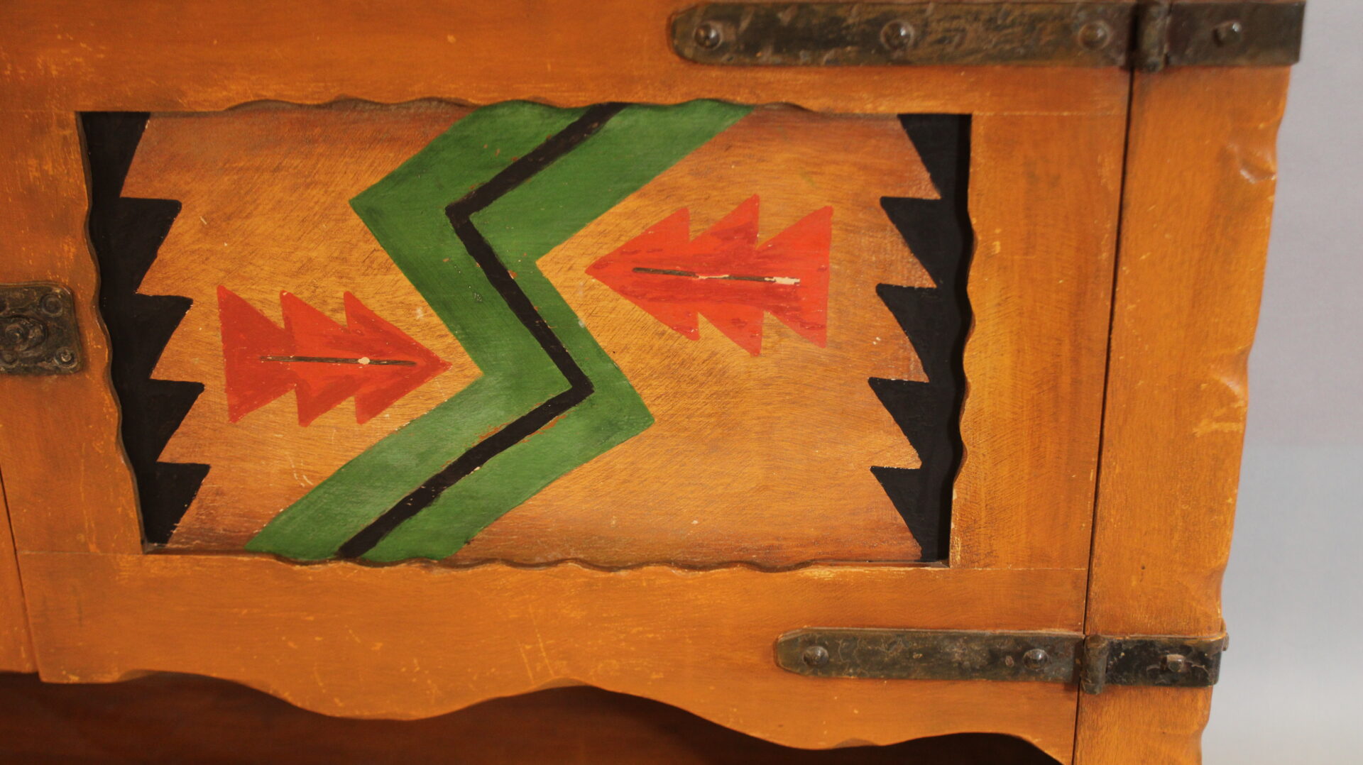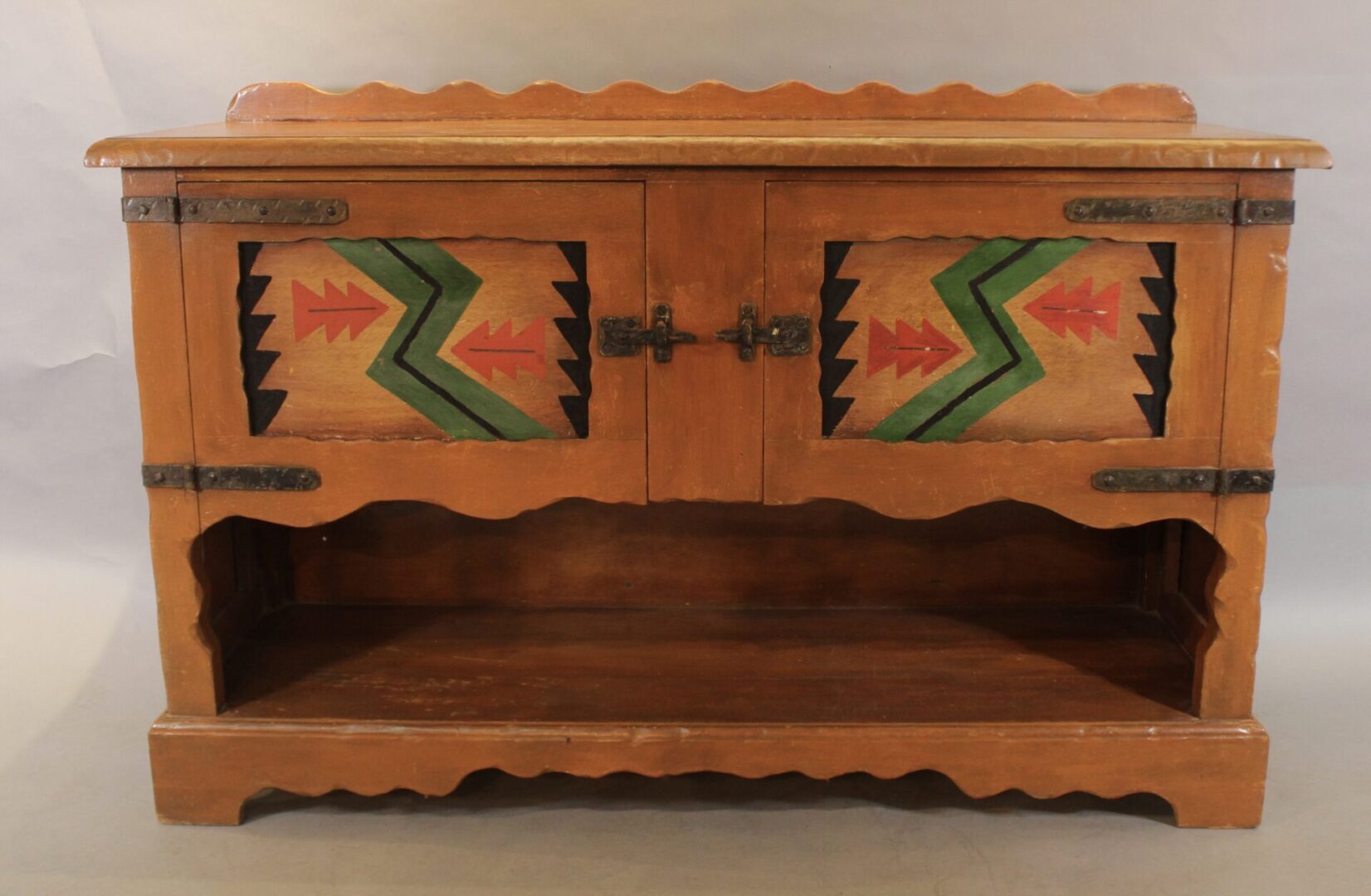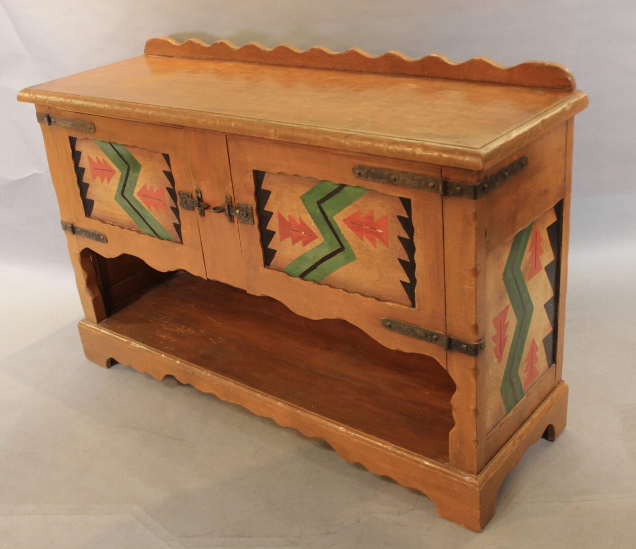 Circa 1920’s sideboard with American Indian motif. 40.5″ H x 62.73″ W x 20″ D