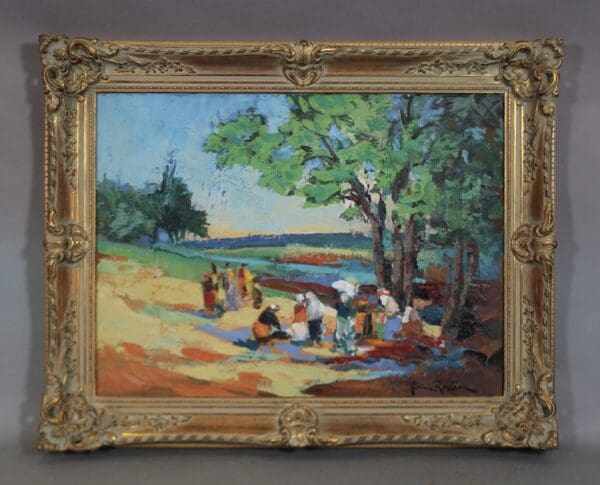 Bodly painted Rosien’s painting depicts a gathering of people under a lush landscape. 23.5″ H x 29.5″ W x 2.5″ D