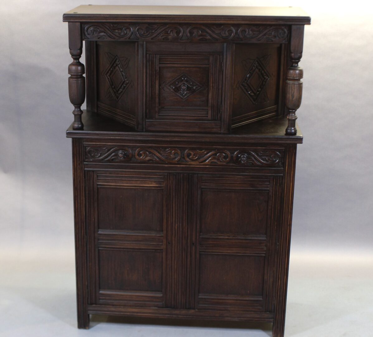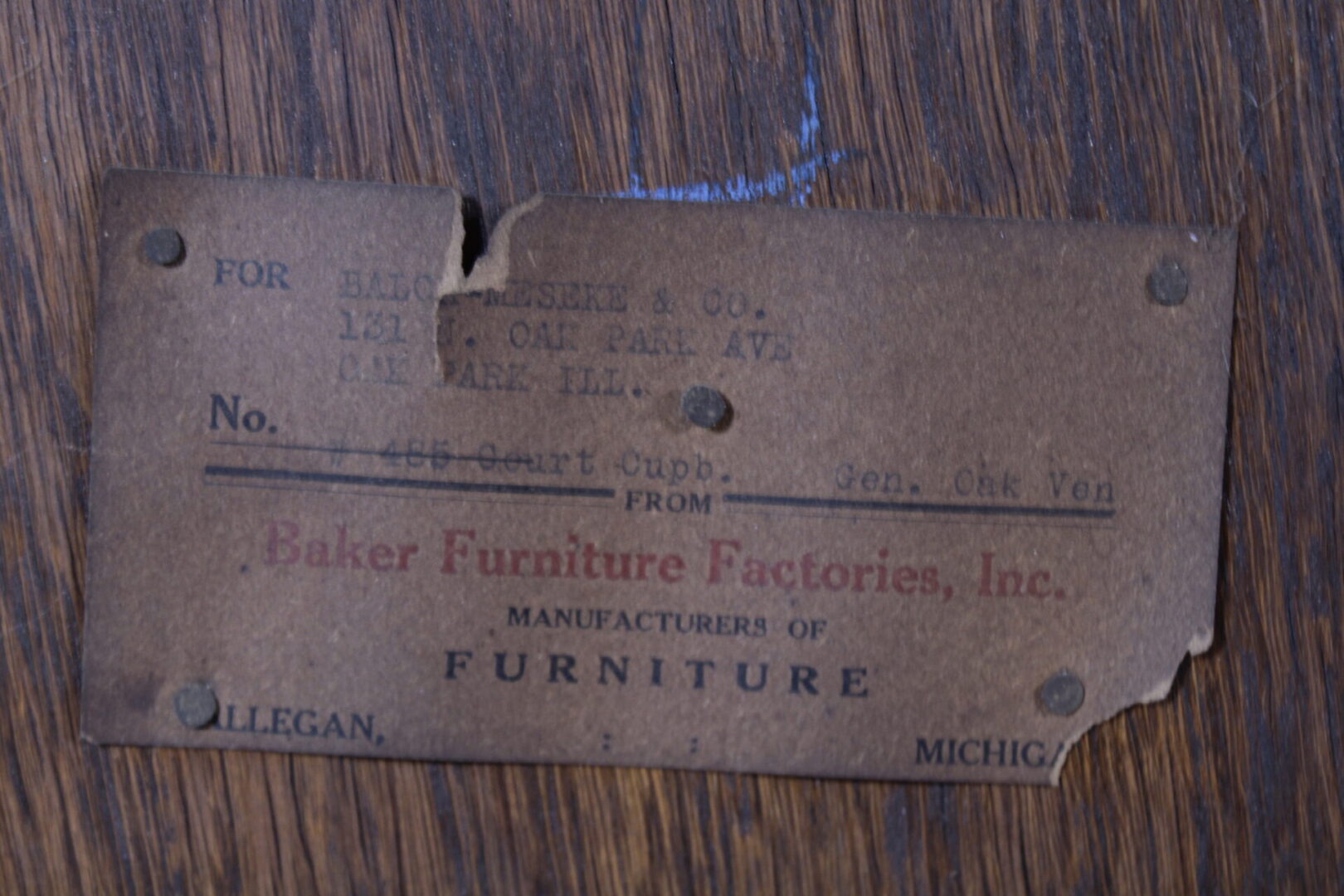Carved oak 1920’s cupboard. The piece retains its original Baker Company label. 60.25 H x 42″ W x 17.5 ” D