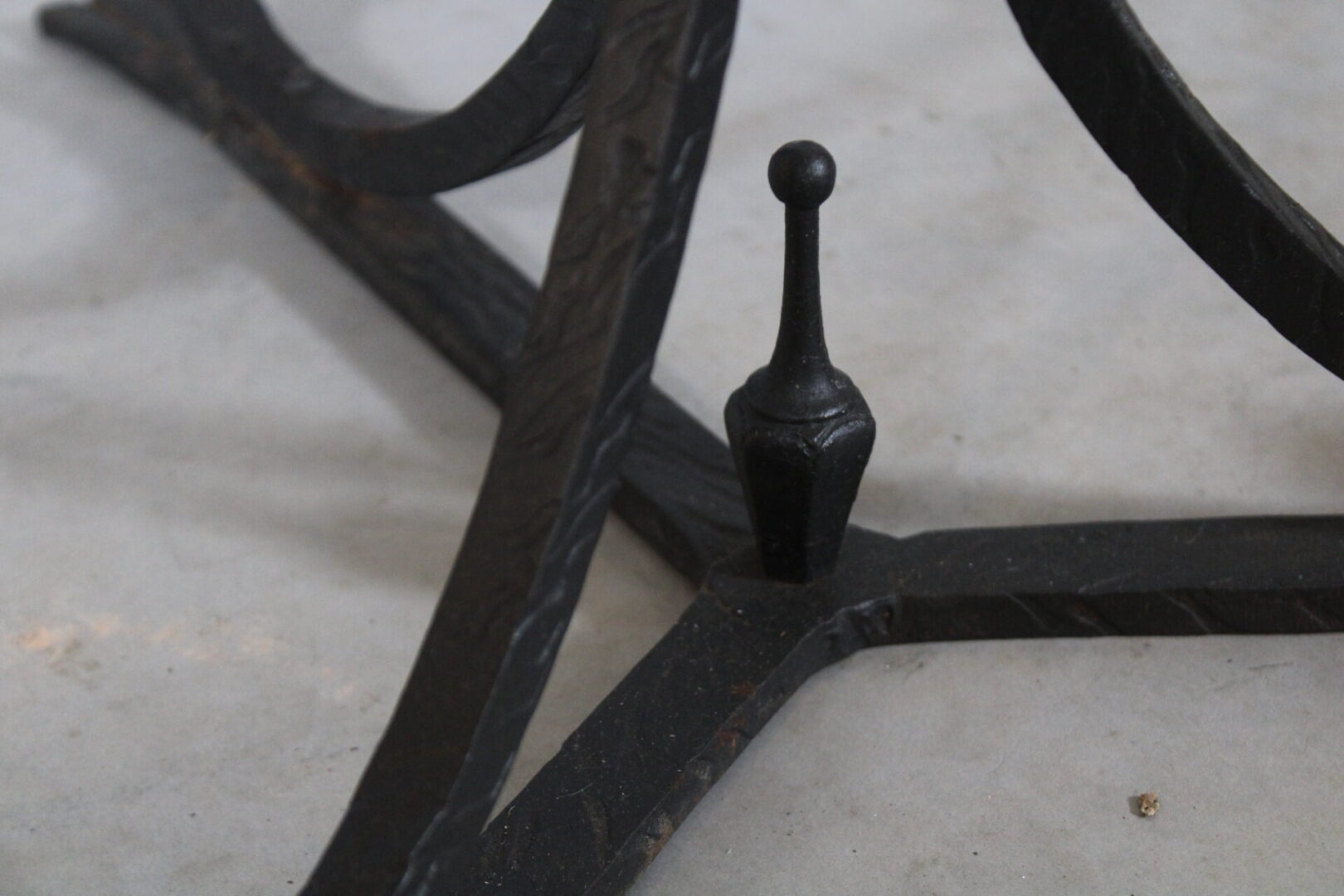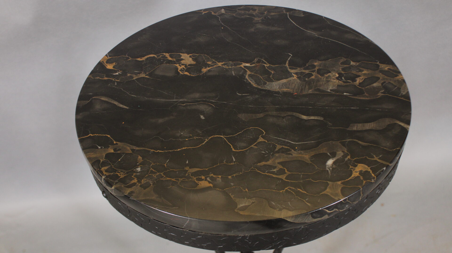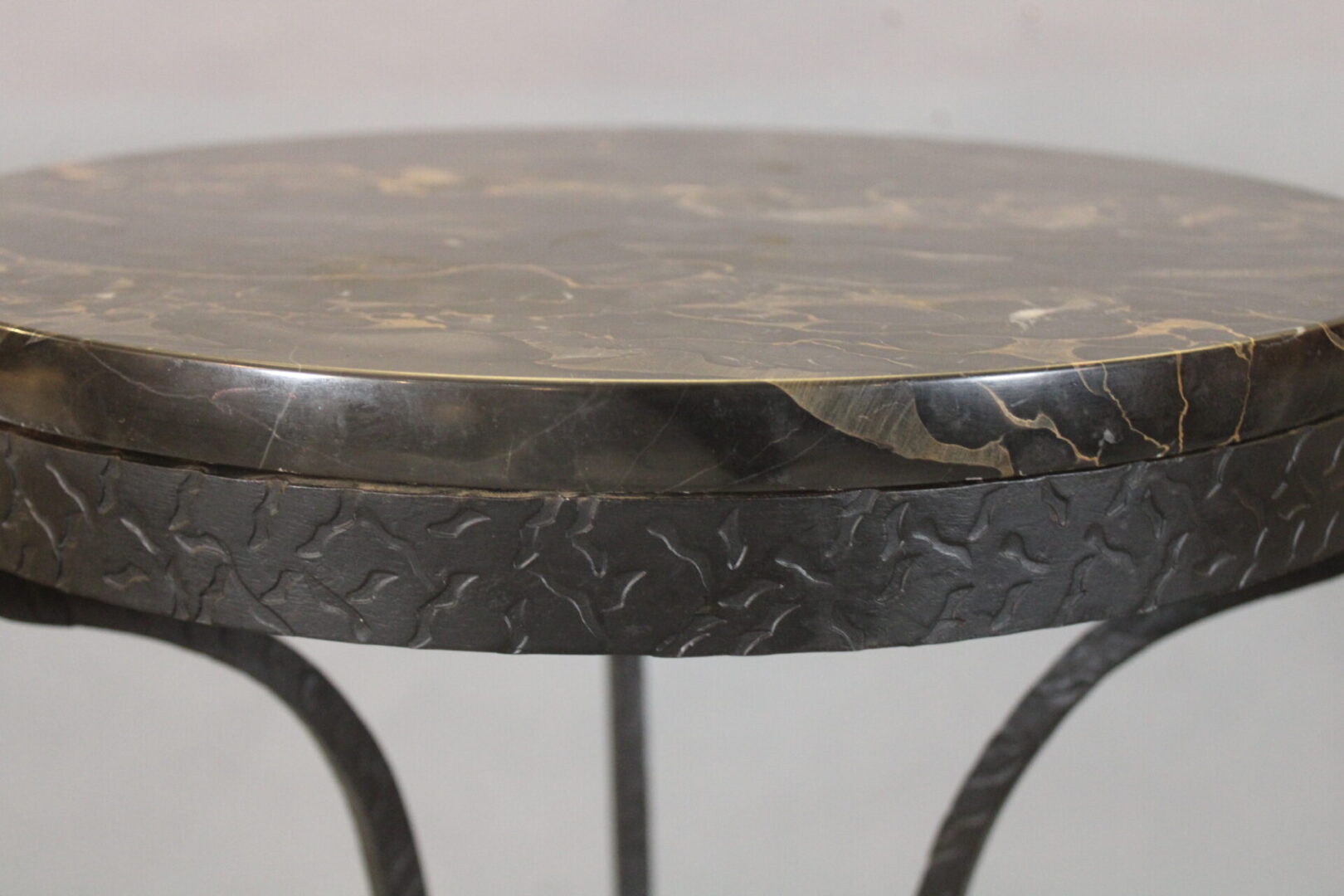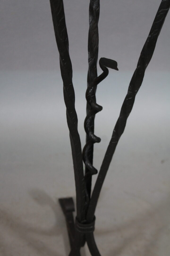 Circa 1920’s iron and marble side table. RefinedĀ craftsmanship. Incised metal. 35″ H x 18.75″ W