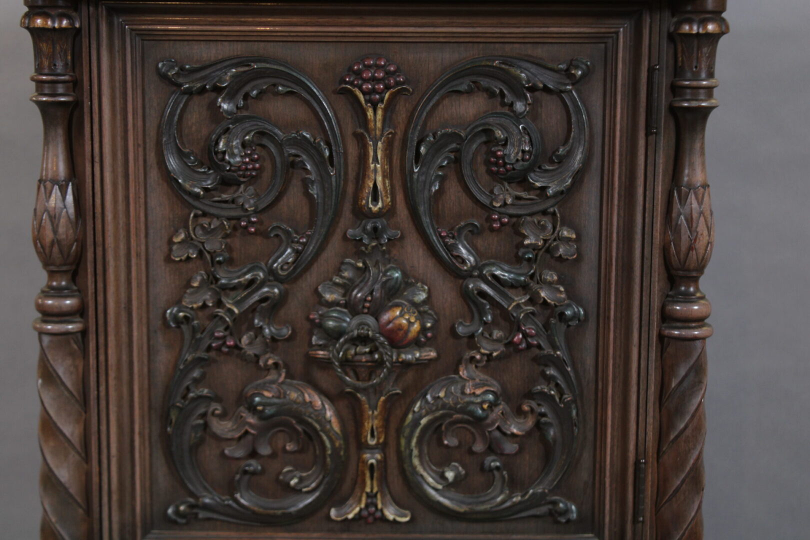 Elegant 1920’s cabinet with carved details and original polychrome finish. 56.25″ H x 28 3/8″ W x 18″
