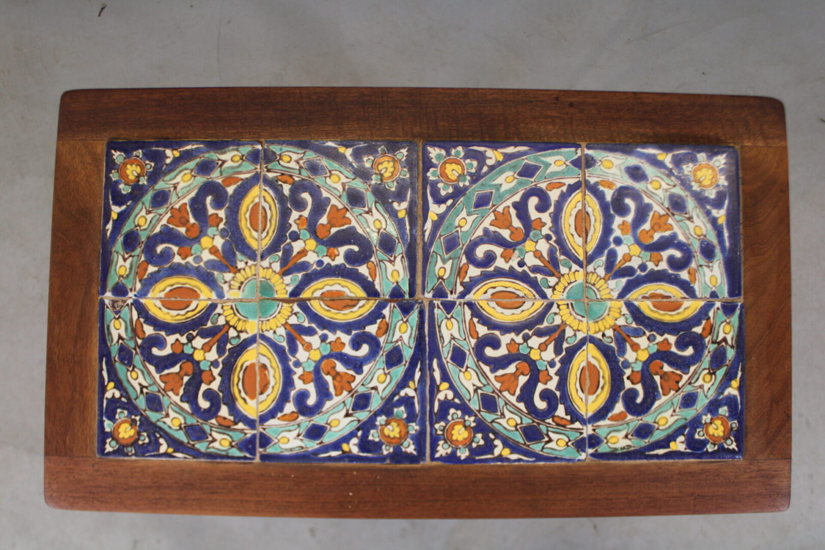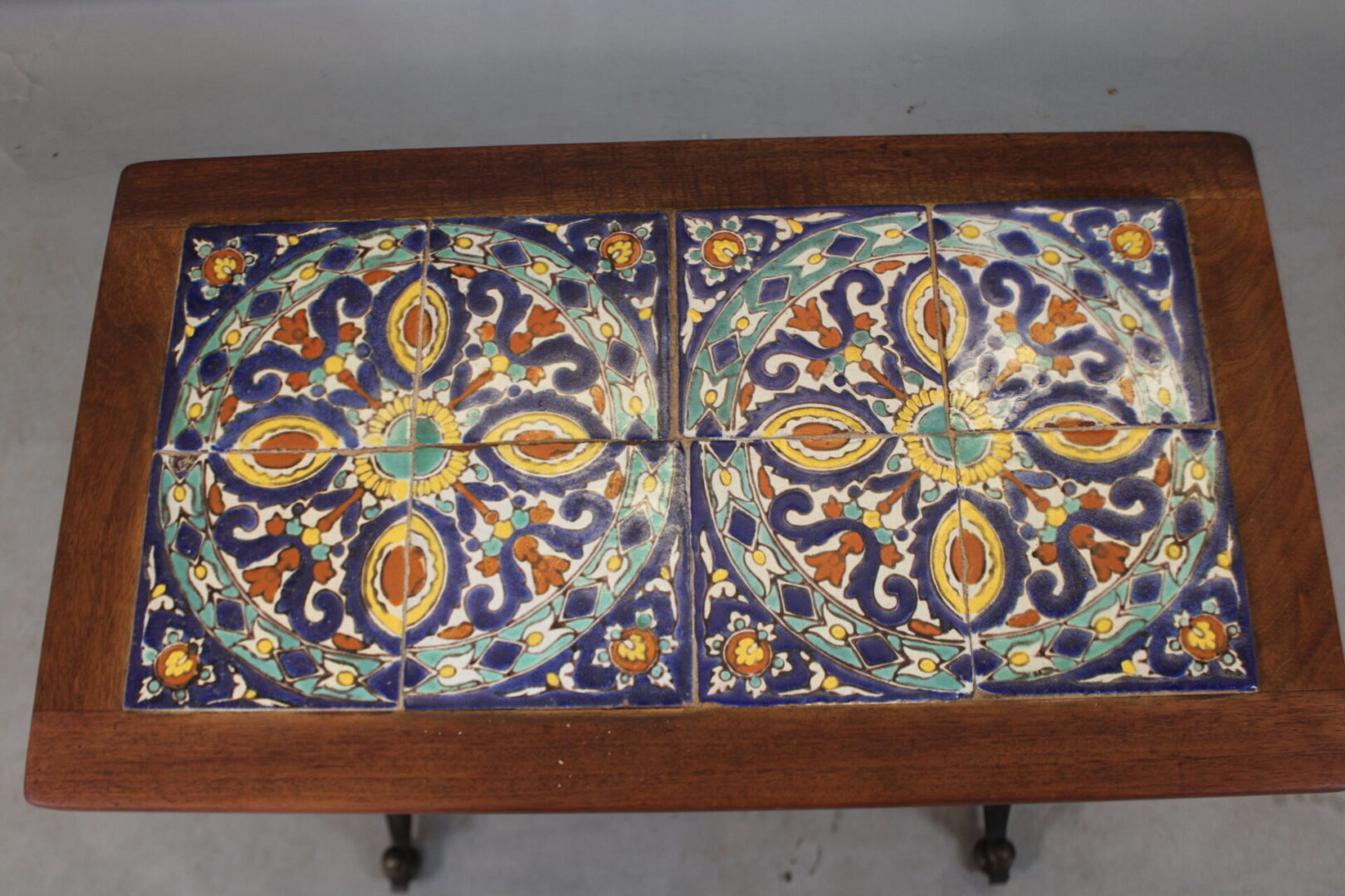 Circa 1920’s iron base tile table with 8 tiles. 21″ H x 27.5″ W x 15.75″ D