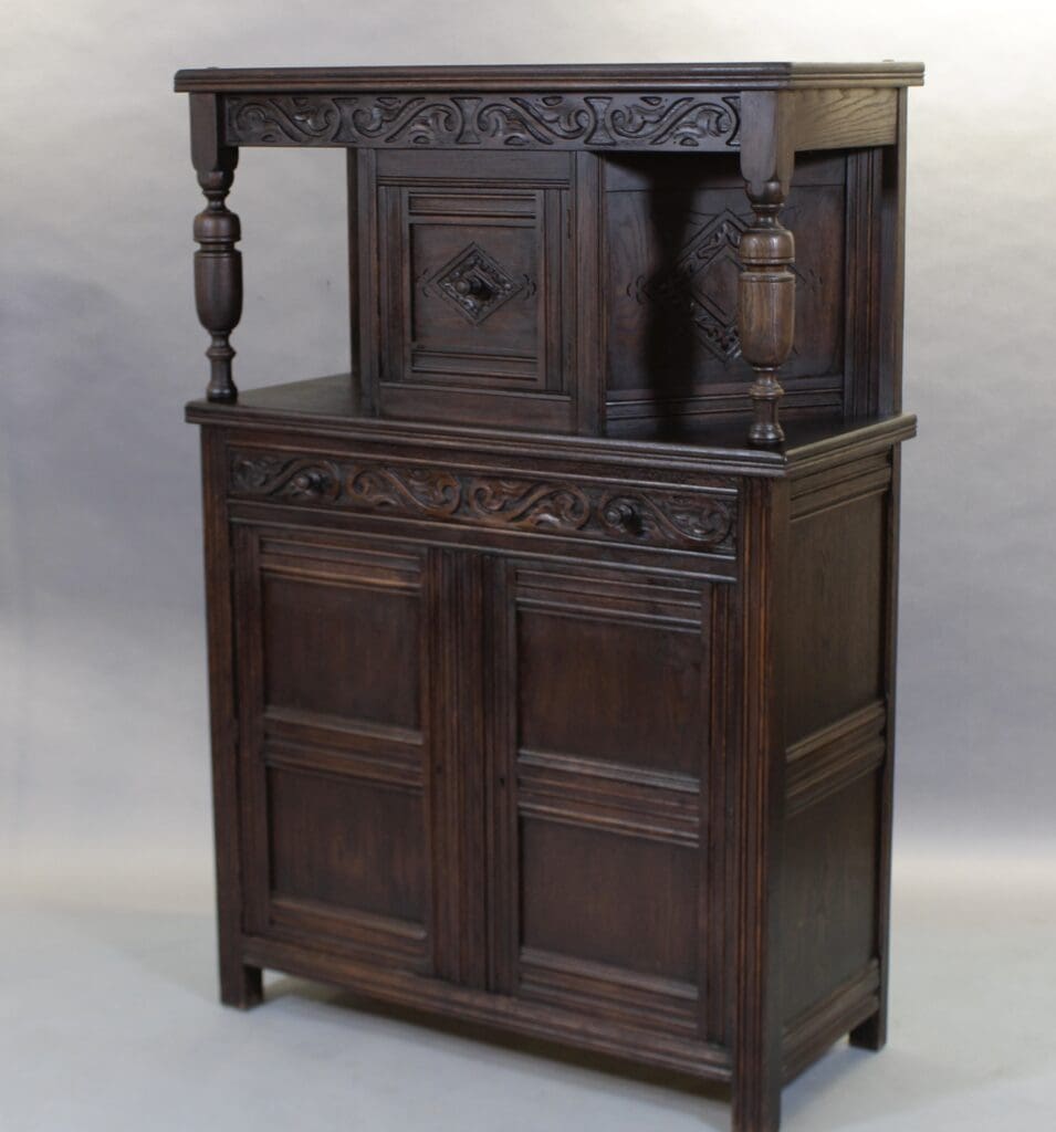 Carved oak 1920’s cupboard. The piece retains its original Baker Company label. 60.25 H x 42″ W x 17.5 ” D