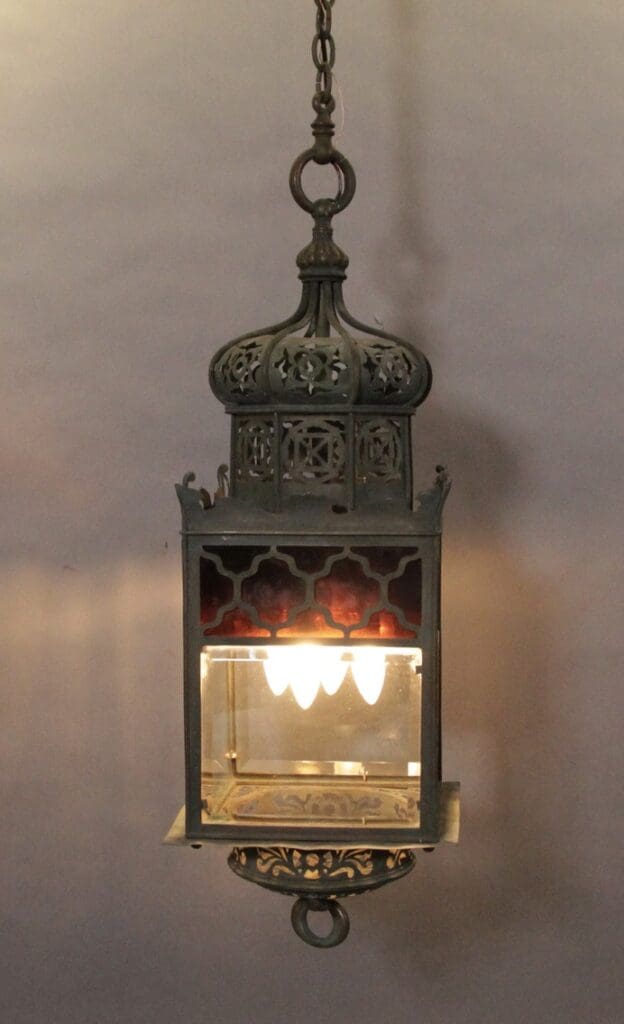 Circa 1920’s. Brass pierced Moorish lantern with beautiful craftsmanship. 49.5″ H x 11″ W x 11″D