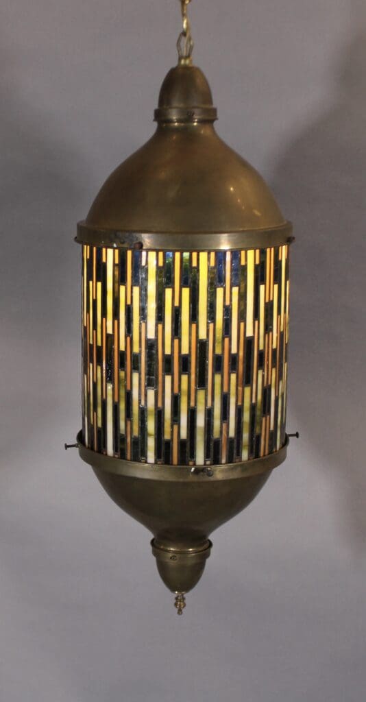 40690. Mid Century Brass And Stained Glass Pendant