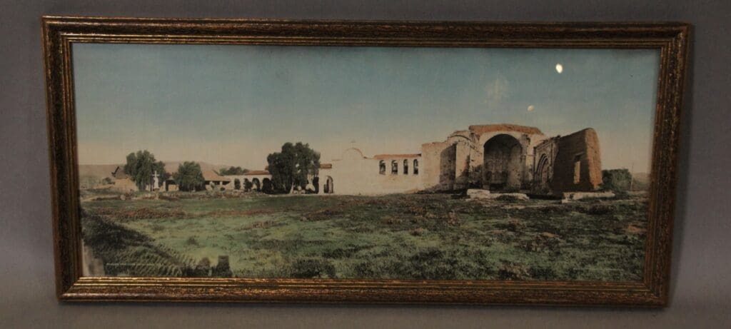 Circa 1920’s. Hand tinted photograph of San Juan Capistrano. 11.75″ H x 25.5″ W x 0.5″ D