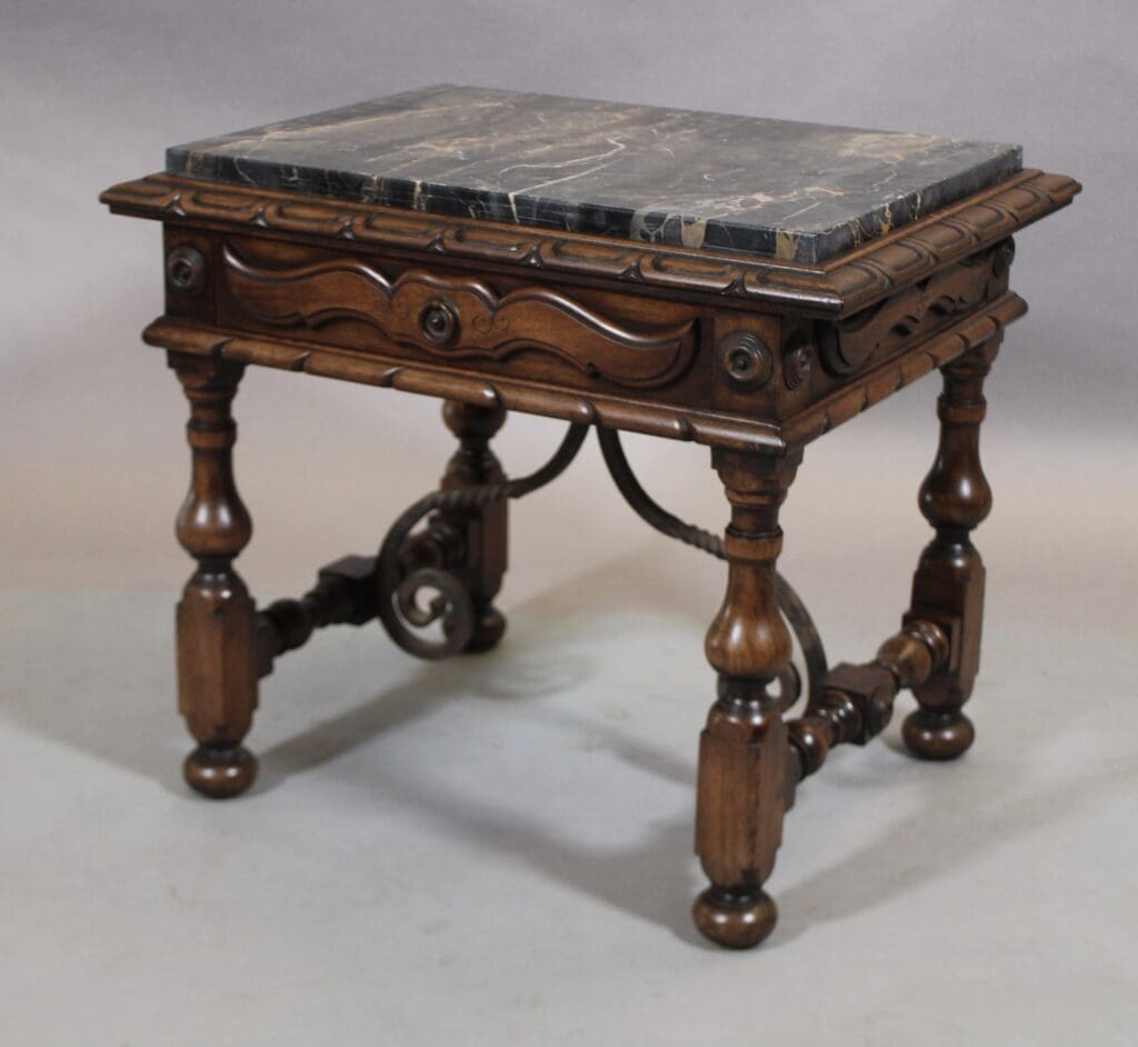 Fantastic 1920’s side table with original marble marked with original 1920’s label. 20″ H x 23.75″ W x 17.75